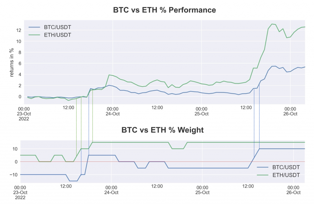 Here is a glimpse into our process, to highlight some of our experiences. Before yesterday's massive outperformance of BTC vs. ETH, our model based on time-series momentum was already anticipating that ETH had better properties in a portfolio combined of these two assets and positioned itself accordingly.